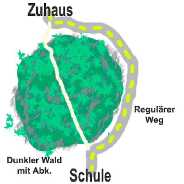 Der schnellste Weg zur Schule führt durch den dunklen Wald. Das ist eine Abkürzung. Sie fürchtet sich nicht, denn im Wald ist es im Sommer kühl und im Winter still. Sie mag es mit dem Wald allein zu sein und nur das Knirschen ihrer Schritte zu hören.